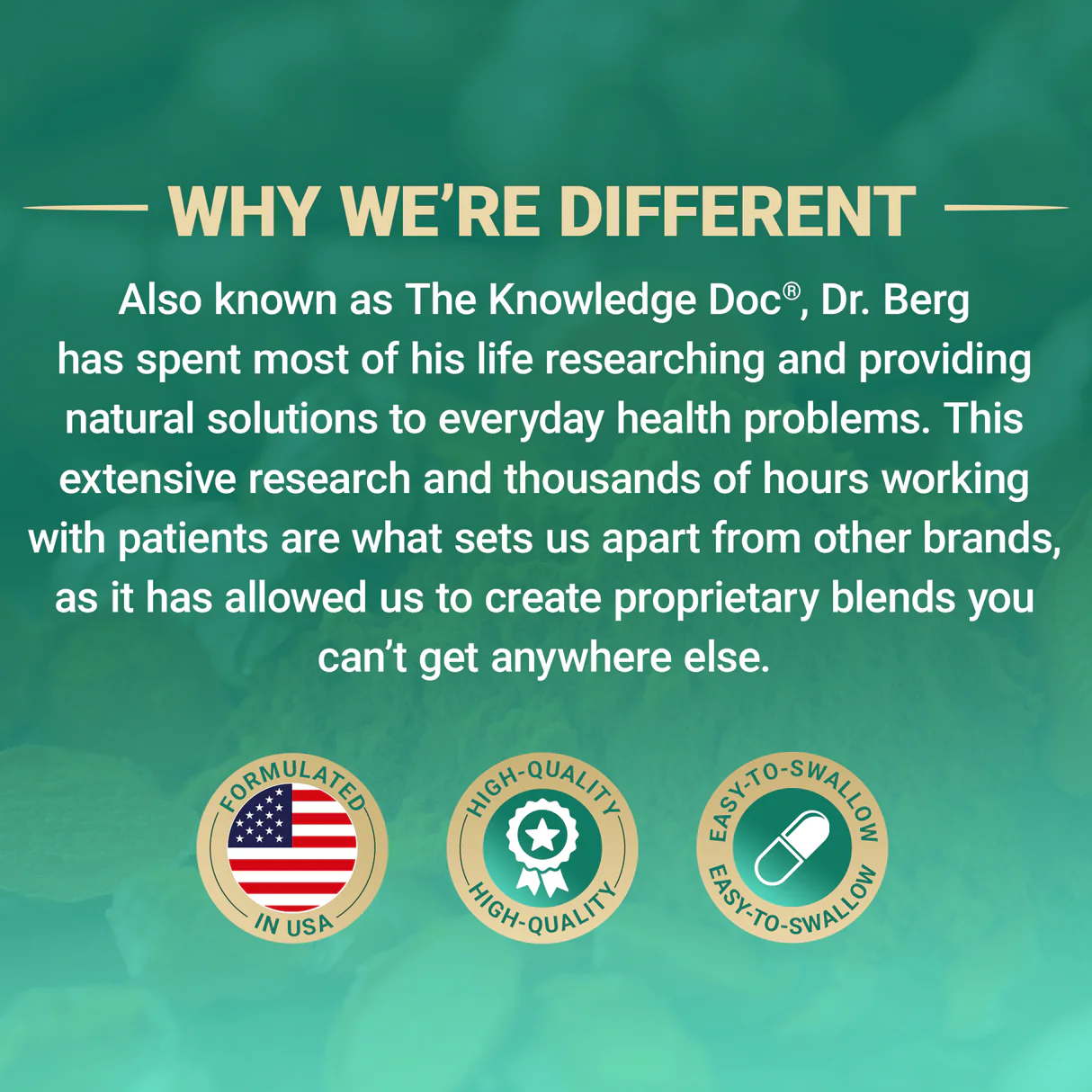 Dr. Berg—also known as The Knowledge Doc—has spent most of his life researching and providing natural solutions to everyday health problems. This extensive research and thousands of hours working with patients are what sets us apart from other brands and have allowed us to develop proprietary blends you can't get anywhere else.