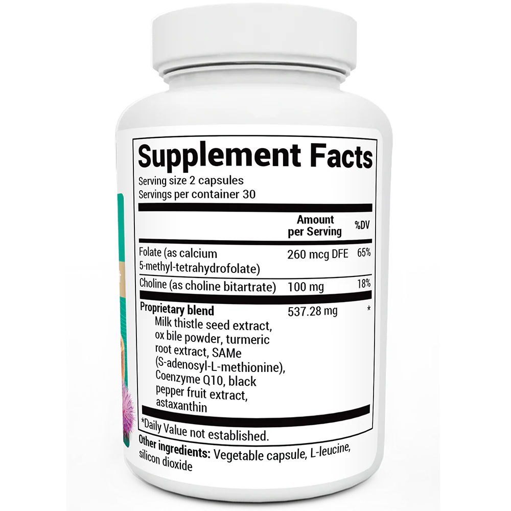 Choline bitartrate, milk thistle extract ( Silybum marianum ), ox bile extract, SAM-e (S-adenosylmethionine), turmeric root extract (95% curcumins), coenzyme Q10, astaxanthin, Bioperine® black pepper extract (95% piperine)